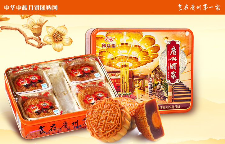 说 明:内装广州伍仁月饼1个*187.5g、蛋黄纯白莲蓉月饼1个*187.5g、蛋黄纯红莲蓉月饼1个*187.5g、蛋黄果仁豆沙月饼各1个*187.5g;彩色豪华铁盒包装;每个月饼独立包装,烫金托盘;配套装刀签及专用豪华手挽袋。