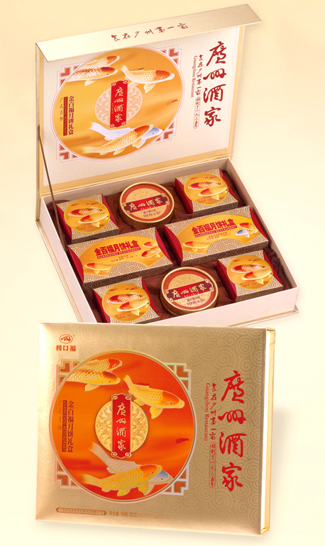 特 色:锦鲤,事业锦绣,百福吉祥,雅致金色与跳跃橙色,一动一静相得益彰,经典与现代的交织,品味“蛋黄纯白莲蓉”的经典,品尝“粟子蓉”、“凤梨”、“福豌豆沙”的新意,不失为上选佳礼。