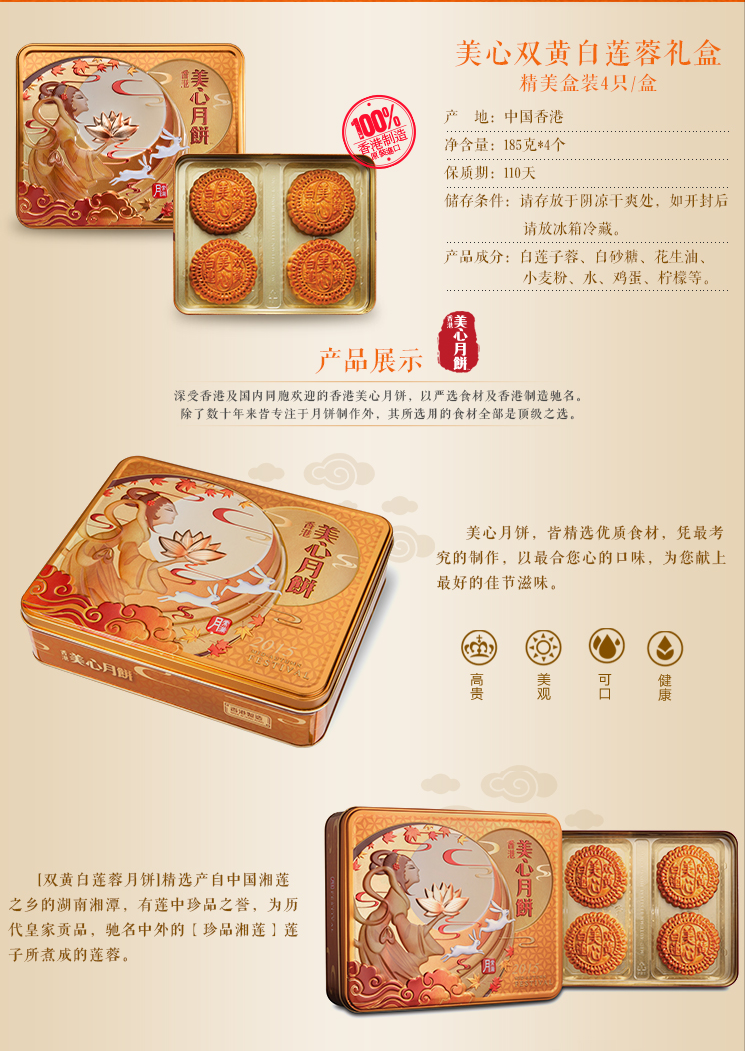 出品商:香港美心月饼连续十一年(1997-2008年)成为全港销量冠军。香港美心月饼精选寸三莲莲子产自中国湘莲之乡湖南湘潭,有莲中珍品之誉,为历代皇家贡品,驰名中外。