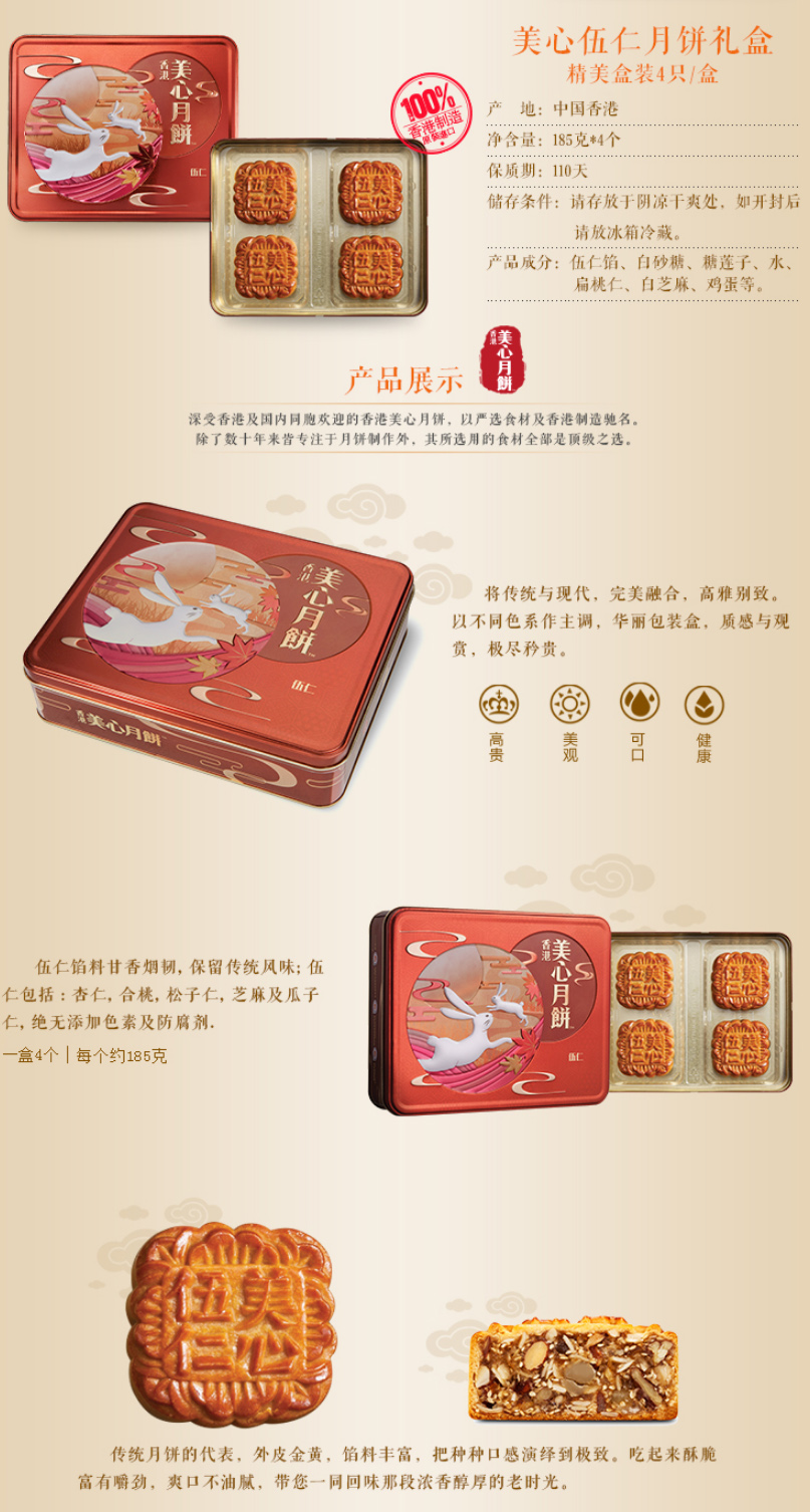 说 明:香港美心金腿五仁月饼,皮薄馅靓,由金华火腿配以香甜烟韧的伍仁馅料,口感十足,令人回味无穷。一盒4个,每个约185克。