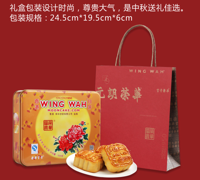 出品商:香港荣华创立于1950年,迄今已有近60年的历史。荣华是最先放弃使用猪油,改用纯植物油、正湘莲子及纯净物质的饼家,并首创白莲蓉月饼,带领月饼新潮流。时至今日,荣华已将月饼品牌行销全世界,在整个华人圈有第一月饼品牌的美誉。
