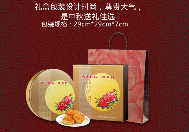 出品商:香港荣华创立于1950年,迄今已有近60年的历史。荣华是最先放弃使用猪油,改用纯植物油、正湘莲子及纯净物质的饼家,并首创白莲蓉月饼,带领月饼新潮流。时至今日,荣华已将月饼品牌行销全世界,在整个华人圈有第一月饼品牌的美誉。