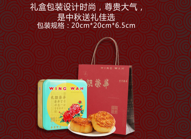 出品商:香港荣华创立于1950年,迄今已有近60年的历史。荣华是最先放弃使用猪油,改用纯植物油、正湘莲子及纯净物质的饼家,并首创白莲蓉月饼,带领月饼新潮流。时至今日,荣华已将月饼品牌行销全世界,在整个华人圈有第一月饼品牌的美誉。