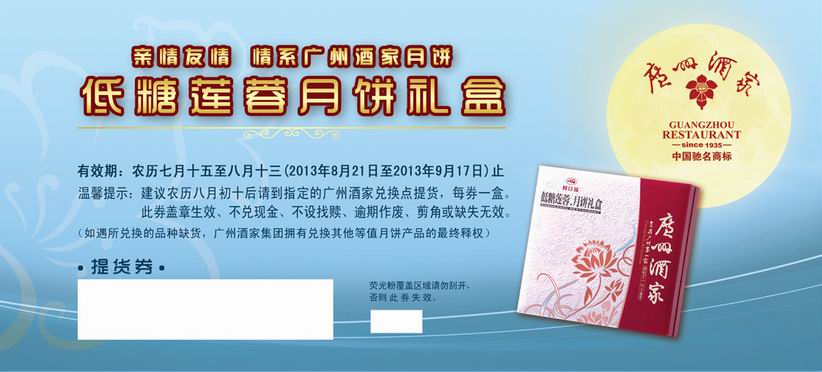 广州酒家低糖莲蓉月饼提货券(健康畅销品)