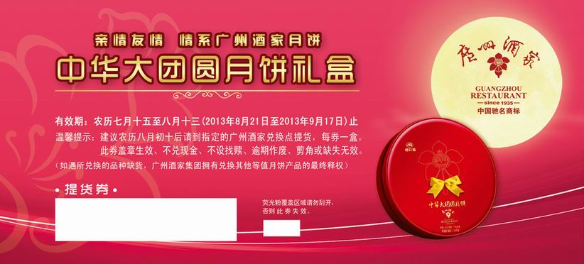 广州酒家中华大团圆月饼 2012年广州酒家新推出的金秋大团圆月饼,具有时尚及传统经典相结合,采用朱红色调皮质外包装,圆形盒里面内含一个1250克的六仁月饼。简约时尚、独特品味、行浓四益,可爱诱人,引领健康风尚,备受都市时尚人群青睐,是中秋节亲朋好友赏月吃月饼和中秋商务送礼馈赠首选!
