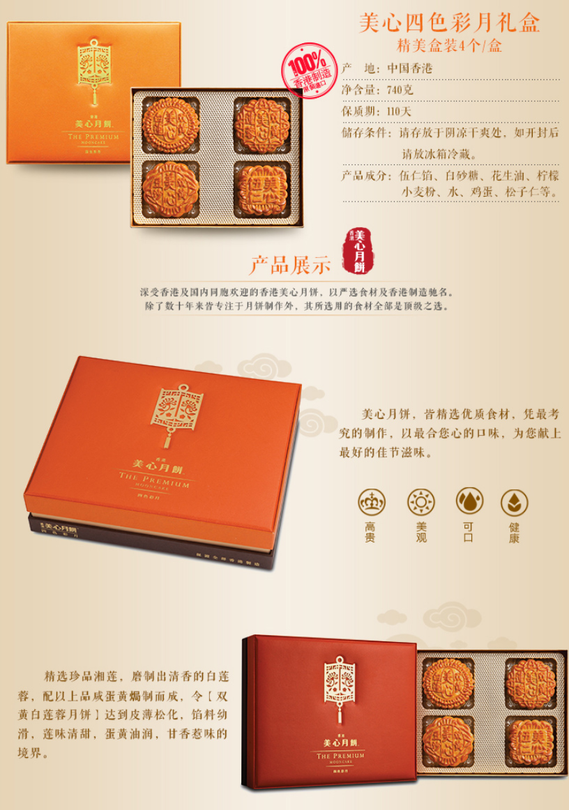 特 色:香港美心四色彩月月饼,香港地道特色的包装设计,包含四香港人至爱的月饼口味,心思献礼,与友分享,同样合宜。