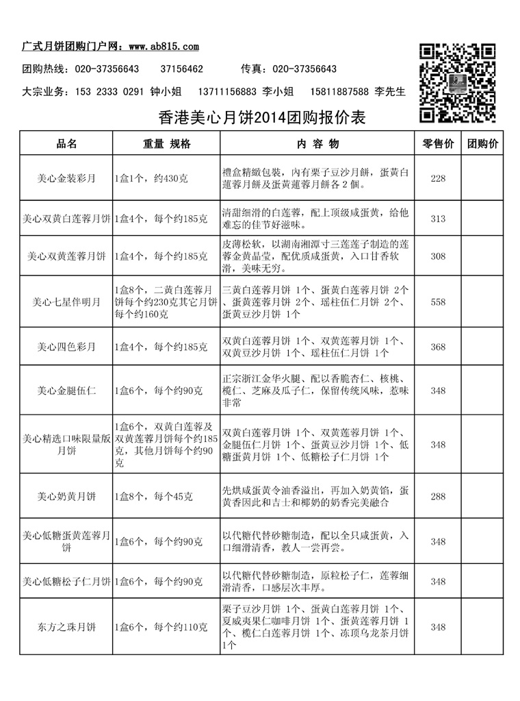 2014香港美心月饼团购报价表如下: