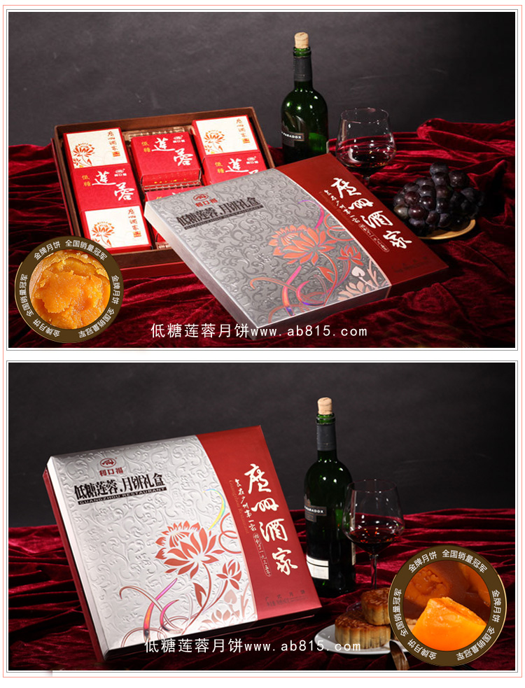 说 明:内含低糖纯红莲蓉月饼4个*105克,低糖纯白莲蓉月饼4个*105克,豪华特型纸盒包装,配套装刀签及专用豪华手挽袋。