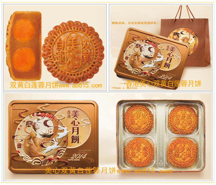 特 色:香港美心双黄白莲蓉月饼,皮薄松软,以湖南湘潭寸三莲莲子制作的白莲蓉晶莹金黄,配以顶级咸蛋黄,入口甘香软滑,不油不腻,口感十足,令你回味无穷。一盒4个,每个约185克。