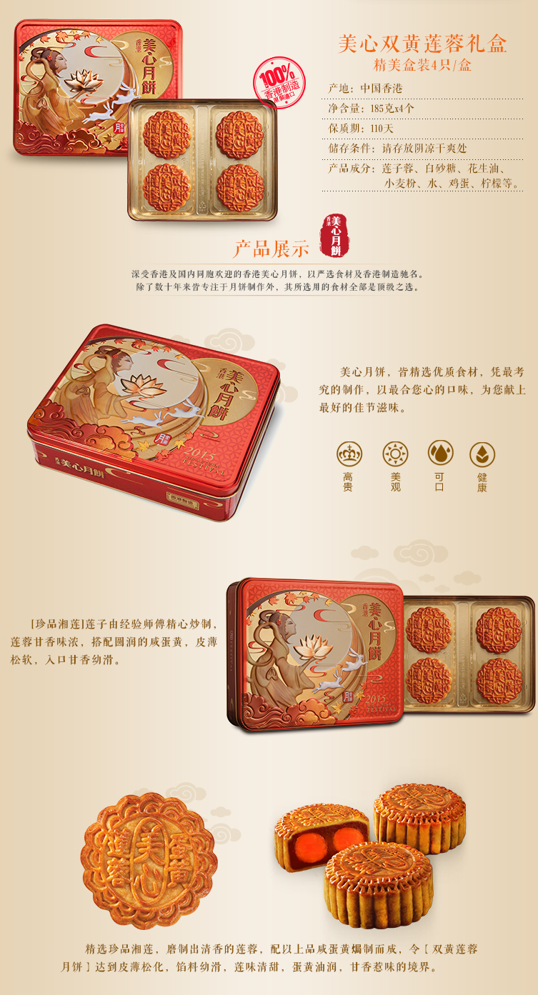 出品商:香港美心月饼连续十一年(1997-2008年)成为全港销量冠军。香港美心月饼精选寸三莲莲子产自中国湘莲之乡湖南湘潭,有莲中珍品之誉,为历代皇家贡品,驰名中外。