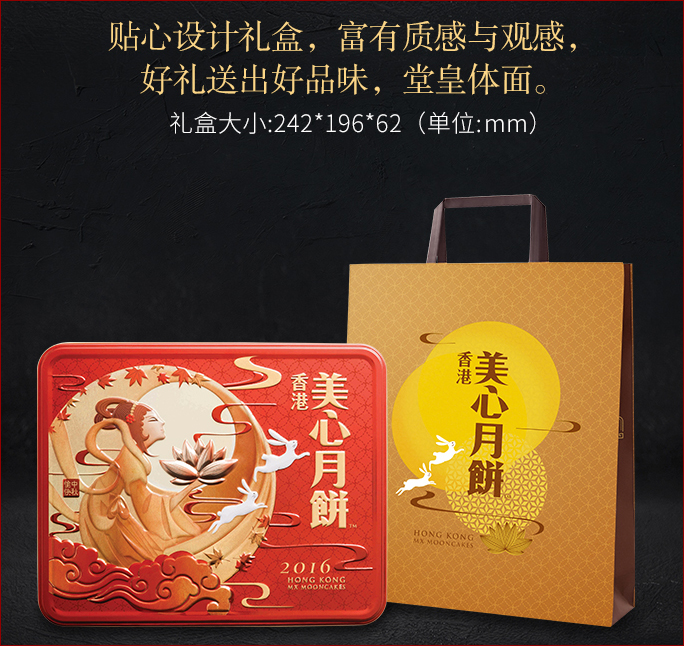 特 色:香港美心双黄莲蓉月饼,皮薄松软,以湖南湘潭寸三莲莲子制作的莲蓉晶莹金黄,配以顶级咸蛋黄,入口甘香软滑,口感十足,令你回味无穷。一盒4个,每个约185克。