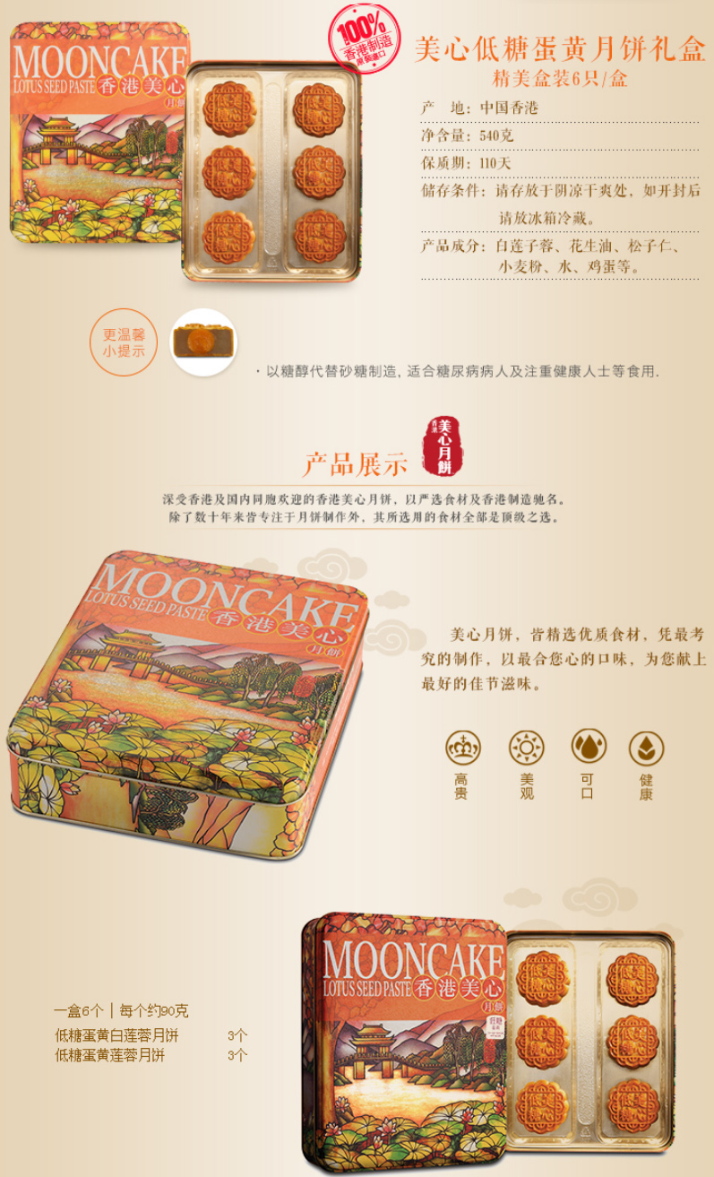 说 明:香港美心低糖蛋黄莲蓉月饼,特别选用各式醣类产品及蔗糖素制造,清香莲蓉配以全只上品咸蛋黄,香滑味美!外盒由香港著名设计师陈幼坚先生设计,月饼盒以「西湖十景」其中一景「苏堤春晓」作主题。一盒6个,每个约90克
