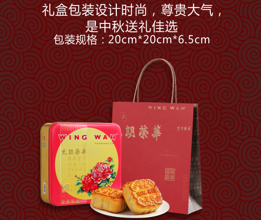 出品商:香港荣华创立于1950年,迄今已有近60年的历史。荣华是最先放弃使用猪油,改用纯植物油、正湘莲子及纯净物质的饼家,并首创白莲蓉月饼,带领月饼新潮流。时至今日,荣华已将月饼品牌行销全世界,在整个华人圈有第一月饼品牌的美誉。