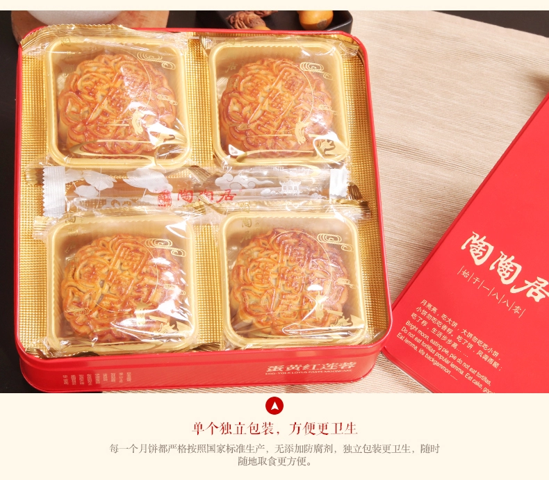 内容物:内含双黄红莲蓉月饼180克*4个;豪华特型铁盒包装,配套装刀签及专用豪华手挽袋。