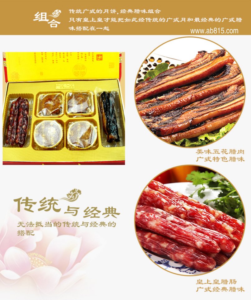 特   色:送礼显心意,体面更大气!皇上皇特别推出传统的广式月饼和最经典的腊味搭配组合——金银满屋月饼腊味礼盒,皇上皇月饼搭配最受消费者欢迎的皇上皇腊味产品,腊味用作中秋晚餐主打食材,月饼则是中秋赏月不可缺少的节庆佳品。礼盒设计精美体面,给亲朋好友送去的不仅仅是一份礼物,更是一份绵长的思念与真诚的祝福!